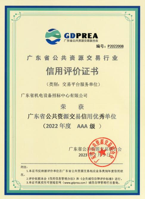 广东省公共资源交易信用优秀单位(2022年度AAA级)